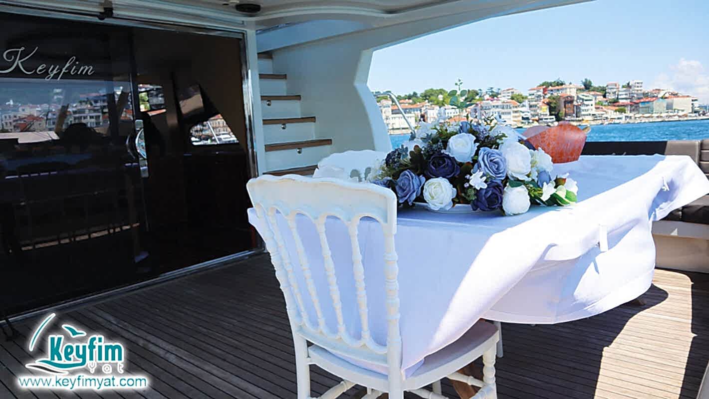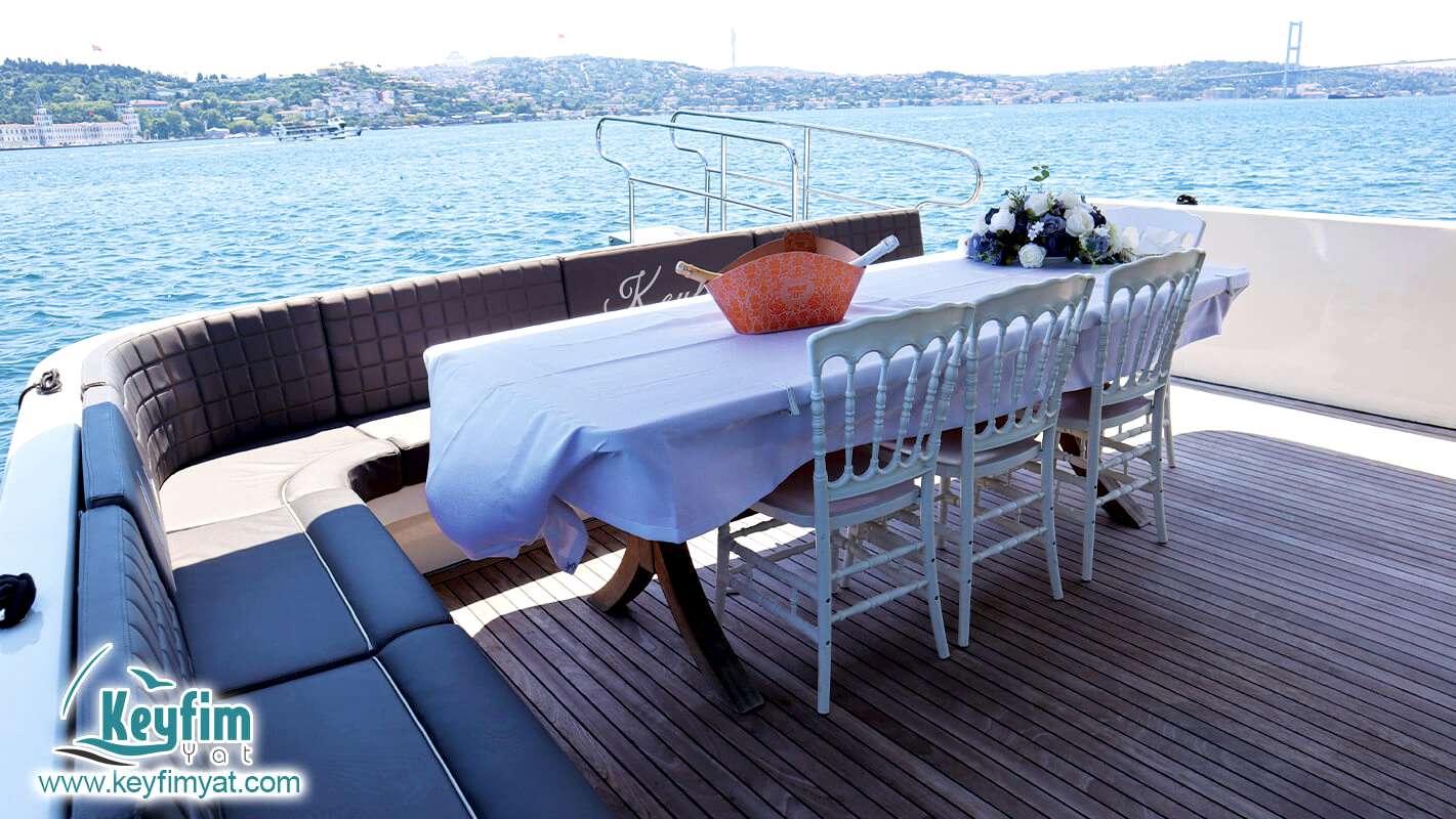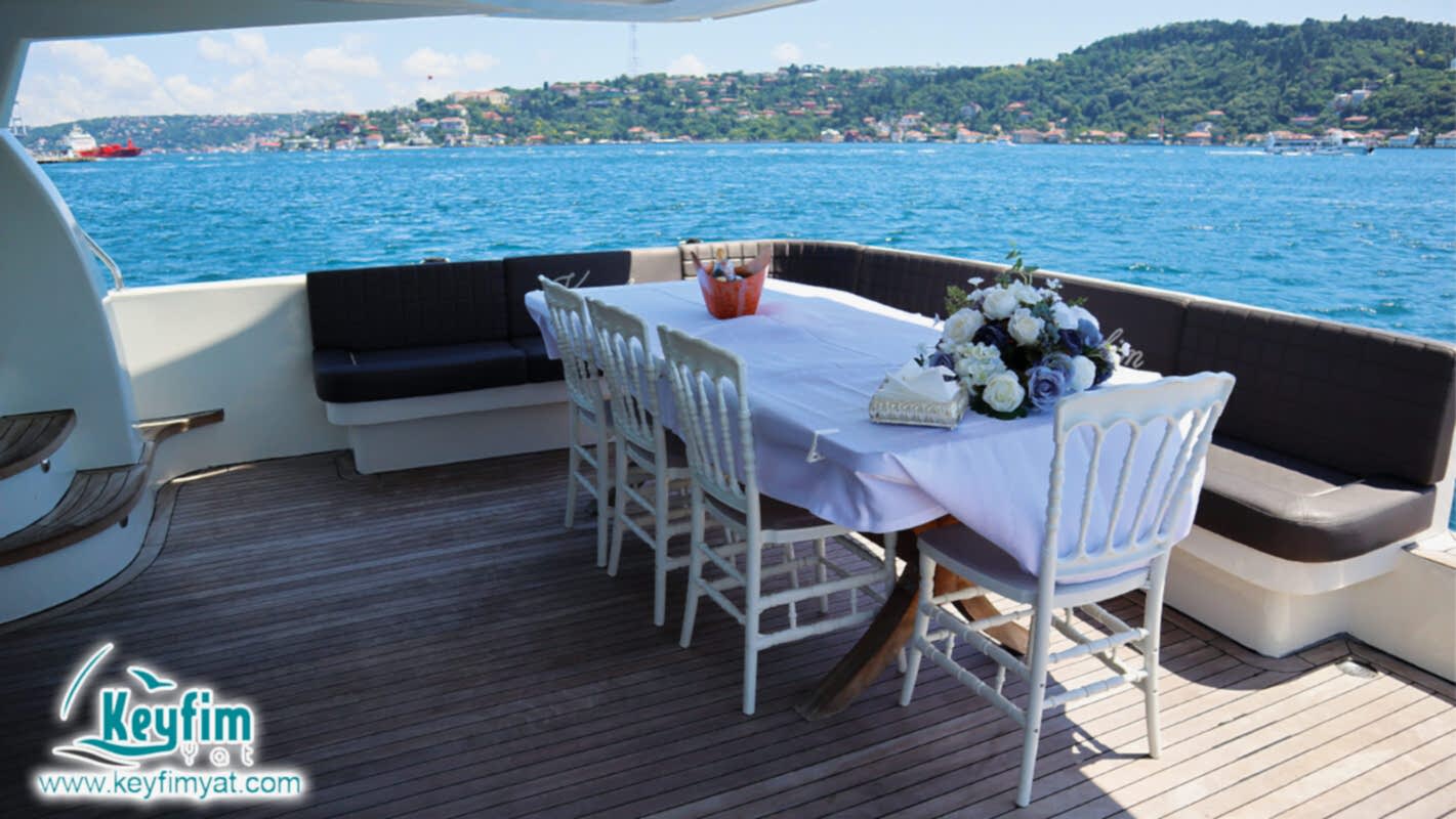 Keyfim Yat; kahvaltı, yemek ve kokteyl düzende en fazla 15-20 kişilik misafir grubunu sorunsuz şekilde ağırlayabilir. Sevdiklerinizle 2 kişilik baş başa romantik organizasyonlar planlayabileceğiniz gibi en fazla 15-20 kişilik katılımın olduğu arkadaş grubunuzla da özel gün organizasyonu yapabilirsiniz.